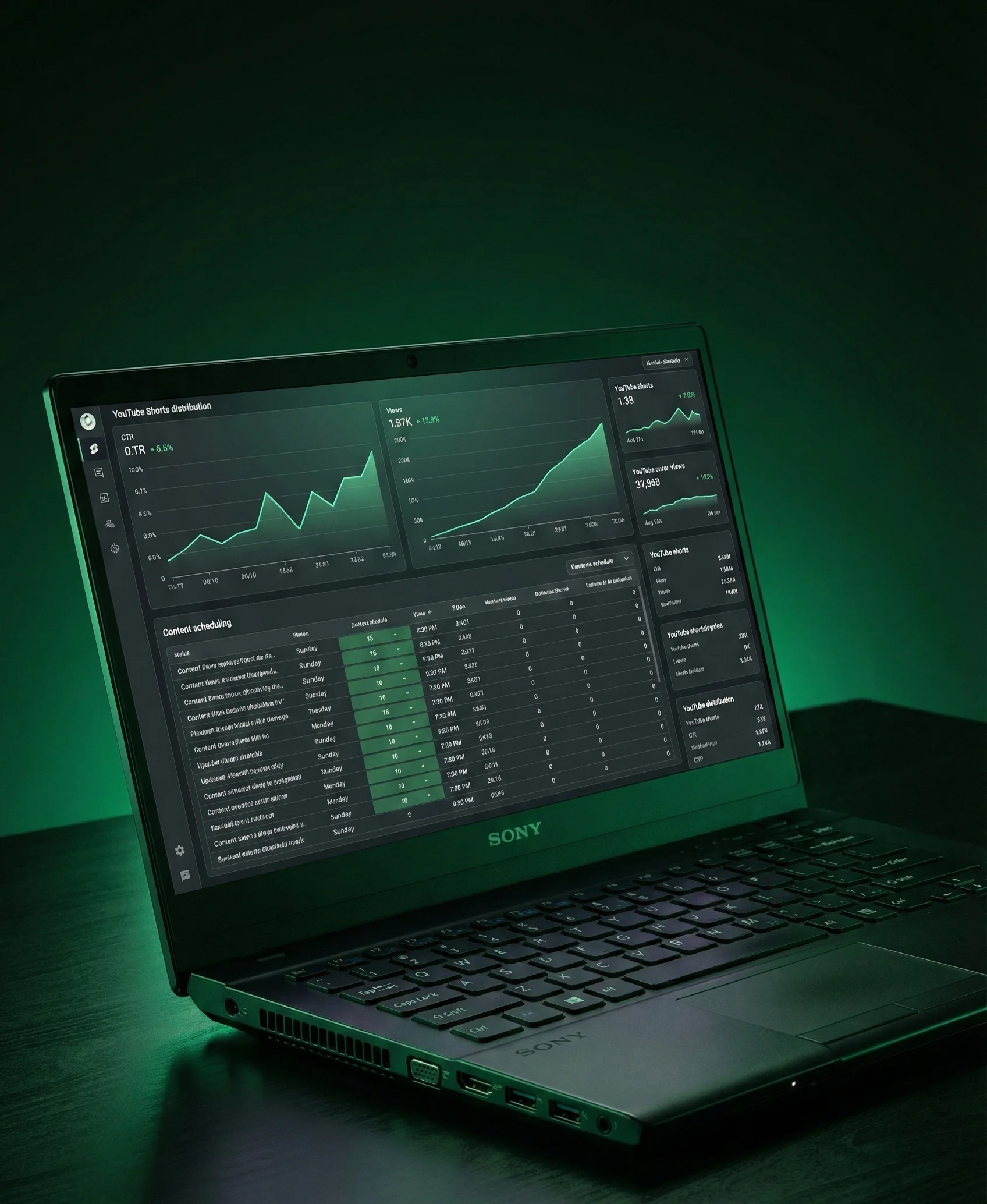Our bot network automatically tests thumbnails and titles, uploading content at precise milliseconds to trigger the YouTube Shorts feed algorithm.